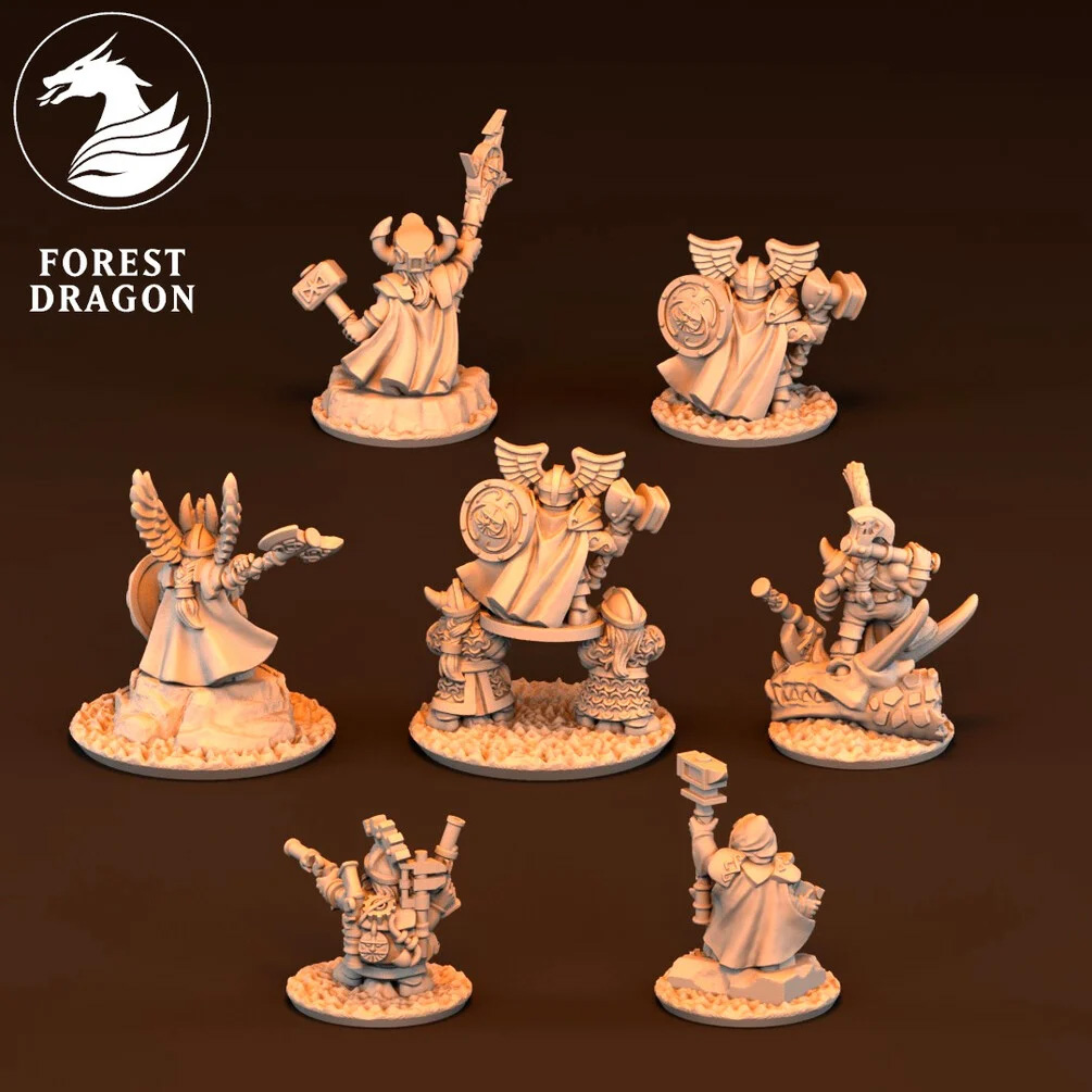 Designed by Forest Dragon, the Dwarf Character Pack is the perfect addition to any Dwarf army. This set includes 6 powerful and distinctive heroes, each with unique abilities to lead your forces to victory. From the commanding General on shield to the mystical High Lore Master, these characters bring unmatched skill, strategy, and arcane power to your battles. With heroes like the Engineer and Berserker hero, your Dwarf army will be prepared for any situation, whether it requires cunning tactics or sheer brute force.